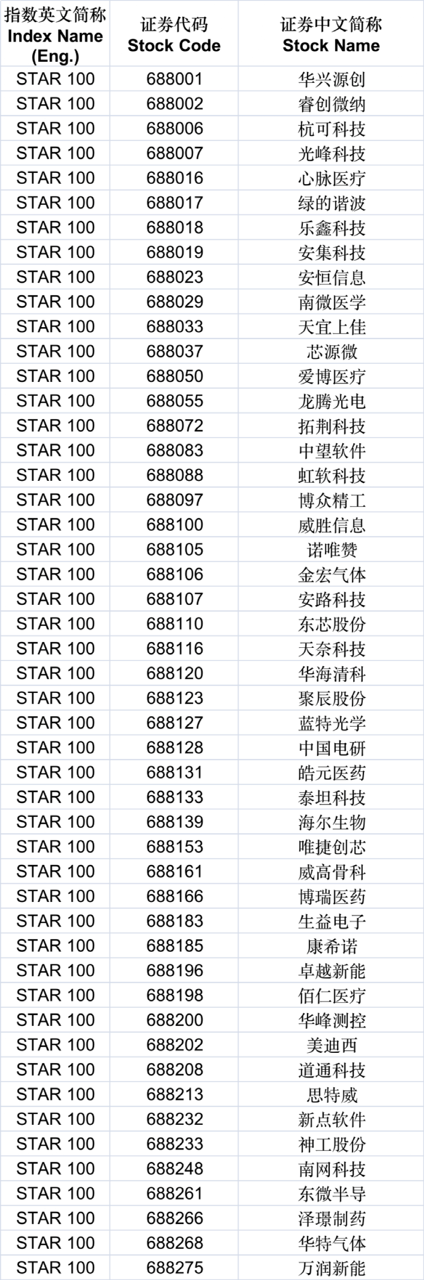 目前指数成分股中,包括了华兴源创、睿创微纳、杭可科技、光峰科技、心脉医疗、绿的谐波、乐鑫科技、安集科技、安恒信息、南微医学、天宜上佳等。
