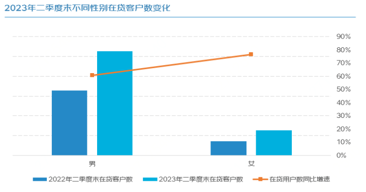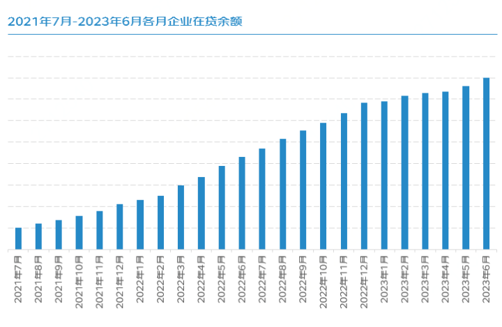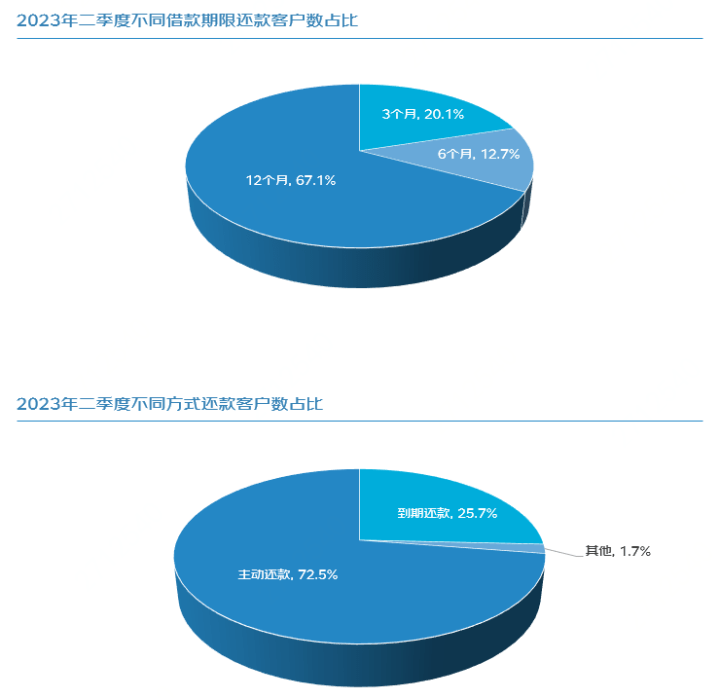 报告显示,2023年二季度企业贷款保持“增量”态势,截至今年6月末,企业在贷余额同比增长了85%,在贷客户数同比增长了64%。自2021年7月以来,企业在贷余额和在贷客户数持续增长,表明企业线上贷款需求一直在增加。虽然今年一季度因春节影响,各项月环比增速波动较大,但自二季度以来,贷款余额和贷款客户数均稳步增加。