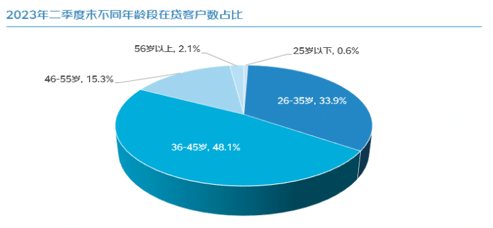 从年龄看,36-45岁用户的在贷客户数占比最高,达48.1%。而从融资活跃度看, 2023年二季度,36-45岁年龄段用户的放款金额占比也最高,且相较去年同期占比进一步提升,可见36-45岁企业主将持续成为企业经营的中坚力量。