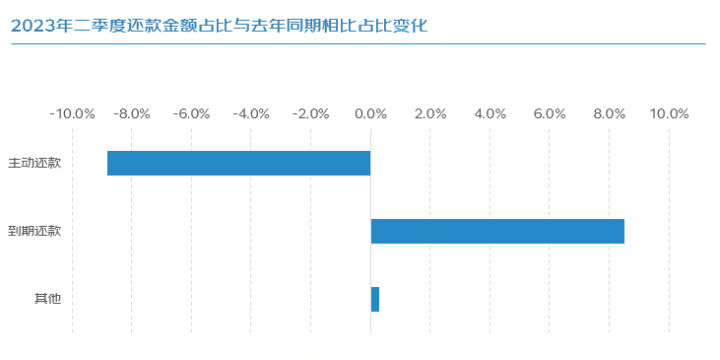 此外,与去年同期相比,2023年二季度选择到期还款金额占比提升明显,一方面反映出相较去年同期,企业实际的融资用款需求在提升,另一方面,企业对于资金的使用计划性也更强,希望通过金融服务让资金发挥最大价值。
