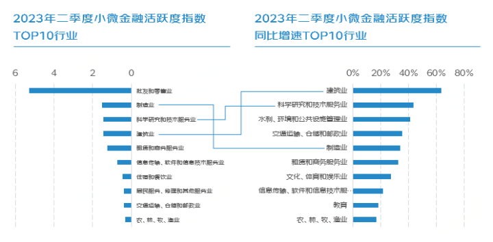 行业方面,今年二季度,批发零售业、制造业、科学研究和技术服务业、建筑业以及租赁和商务服务业的小微金融活跃度指数最高。这反映出这几个行业的融资需求和活力仍然旺盛。值得一提的是,今年第二季度,制造业的小微金融活跃度指数第二,增速第五,相较其他实体行业表现较为亮眼。在制造业细分领域中,第二季度,金属制品业、通用设备制造业、专用设备制造业、电气机械和器材制造业、纺织服装、服饰业的小微金融活跃度指数位列制造业前十,显示这些企业在第二季度的融资需求和活性较高。
