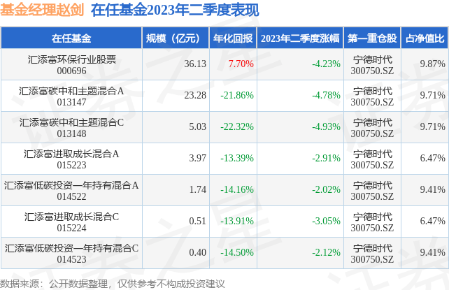 截止2023年二季度末,基金经理赵剑旗下共管理7只基金,本季度表现最佳的为汇添富低碳投资一年持有混合A(014522),季度净值跌2.02%。