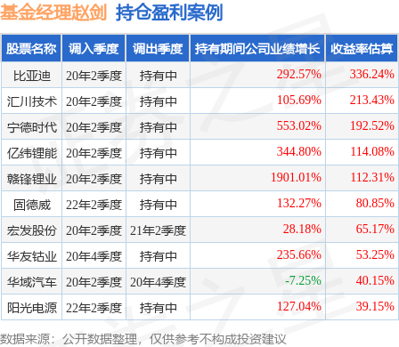 赵剑管理的汇添富环保行业股票基金在20年2季度买入比亚迪,已连续持有3年又0个季度。持有期间的估算收益率为336.24%,持有期间比亚迪在2020年到2022年的年报归属净利润增幅达292.57%。