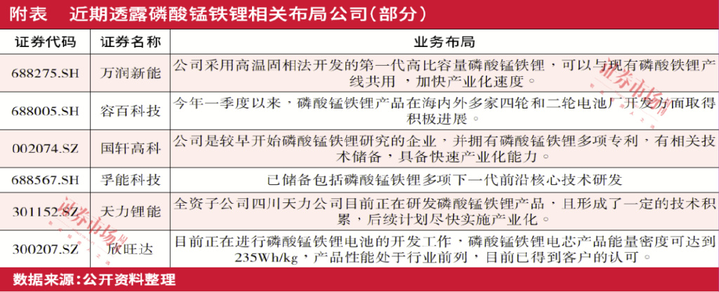 此外,万润新能、容百科技、国轩高科、孚能科技、天力锂能等公司也已纷纷公开了在磷酸锰铁锂方面的布局(见附表)。