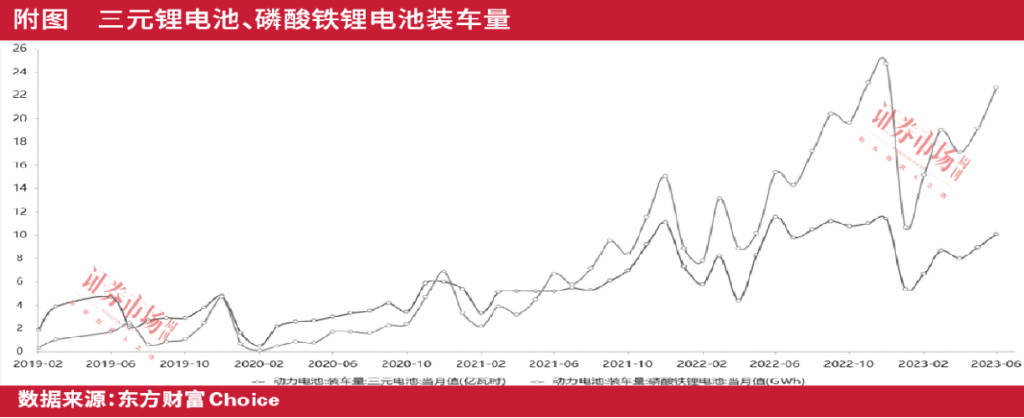 据最新披露的行业数据显示,2023年6月,在动力电池方面,三元锂电池的装车量为10.1GWh,同月,磷酸铁锂电池的装车量则为22.7GWh,是三元锂电池装车量的2倍。事实上,磷酸铁锂电池超越三元锂电已经持续了多个月份。如自2021年6月以来,磷酸铁锂电池的装车量就持续领跑三元锂电池(见附图)。