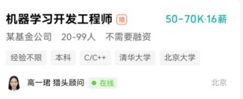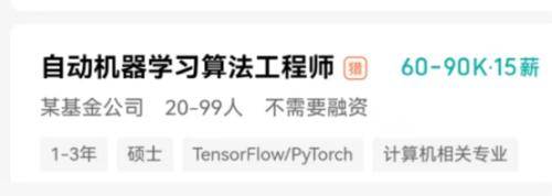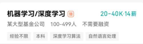 另一家大型基金公司也在招聘机器学习/深度学习,开出25-50K·23薪的有竞争力的薪资。还有基金公司给出60-90K·15薪的更高筹码。