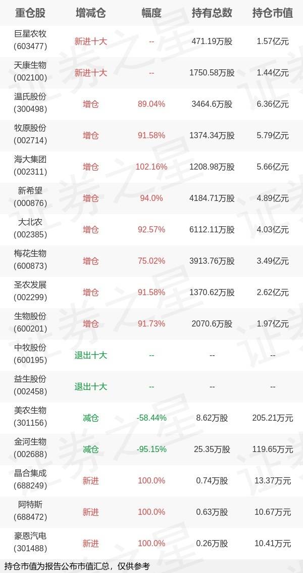 7月21日国泰基金旗下梁杏管理的国泰中证畜牧养殖交易型开放式指数基金公布中报,近1年净值增长率-17.24%。与上一季度相比,该基金前十大重仓股新增巨星农牧,天康生物;并对温氏股份增仓1631.89万股,为该基金第一大重仓股;中牧股份,益生股份等退出前十大重仓股;详细数据如下: