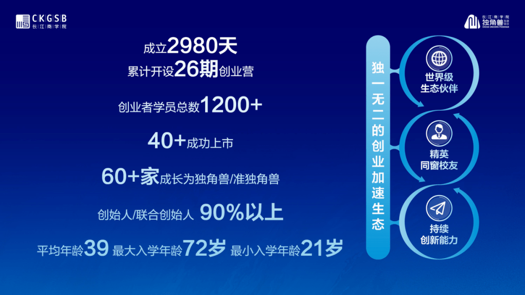 自2015年起,长江商学院便致力于在国内乃至全球搭建培育新生代独角兽的生态体系,培养更具全球责任、更具社会目的和功能、更具长线思维的新生代独角兽,也因此成立了创业创新平台长江创创社区,通过专业、聚焦、创新的创业课程和开放跨界的社群服务为创业者升级思维认知和管理框架。