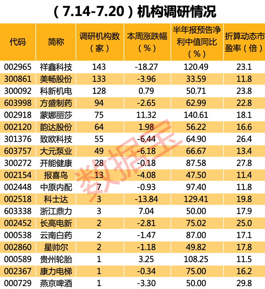 数据宝统计显示,根据半年报业绩预告中值计算,近一周机构调研的上市公司中,祥鑫科技、美畅股份、科新机电等个股净利同比增长超30%且滚动市盈率低于35倍。其中,晶澳科技、蒙娜丽莎、科士达等个股净利增速均超100%。