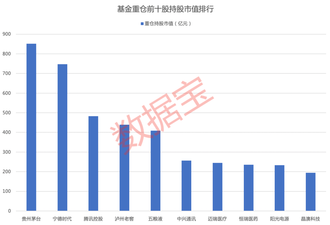 从持股市值来看,公募基金二季度全部重仓股(含港股)中,贵州茅台、宁德时代、腾讯控股、泸州老窖、五粮液、中兴通讯、迈瑞医疗、恒瑞医药、阳光电源、晶澳科技位列前十大重仓股。