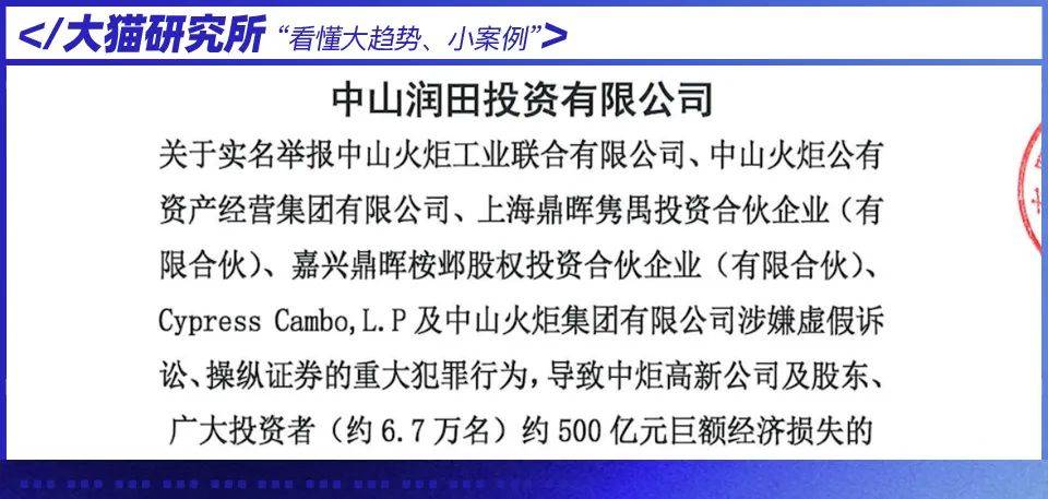 在7月12日,中山润田就在宝能官网发了举报信,一口气举报了中山火炬等6个股东,原因是他们涉嫌虚假诉讼、操纵证券的重大犯罪,导致中炬高新及股东们大约500亿的经济损失。