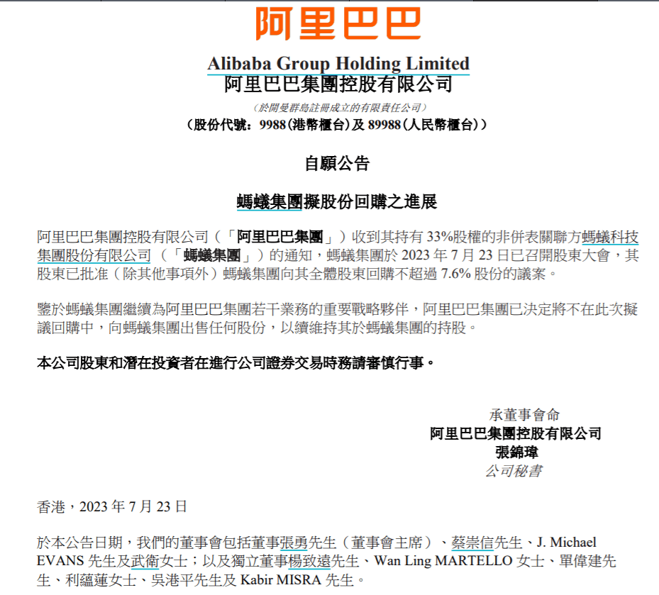 阿里巴巴表示,鉴于蚂蚁集团继续为阿里巴巴集团若干业务的重要战略伙伴,阿里巴巴集团已决定将不在此次拟议回购中,向蚂蚁集团出售任何股份,以续维持其于蚂蚁集团的持股。