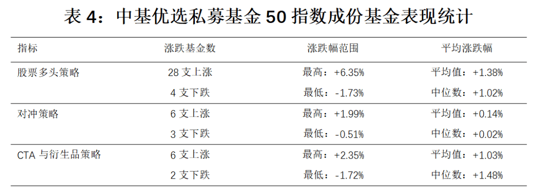 上周50支成份基金中有40支盈利,从统计指标上看,三类策略中,CTA与衍生品策略的盈亏分布比较均衡。