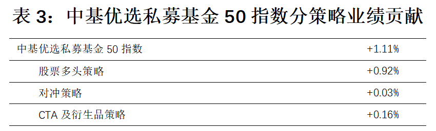 上周,中基私募50指数上涨1.11%,股票多头策略盈利0.92%,对冲策略盈利0.03%,CTA及衍生品策略盈利0.16%。