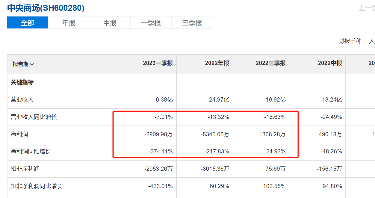 “每日资本论”梳理中央商场财报发现,其扣非净利润自2018年以来一直处于亏损状态,5年累计扣非净利亏损约11.7亿元。2023年一季度,中央商场营收6.38亿元,同比下降7.01%;净利润亏损2909.98万元,同比下降374.11%。