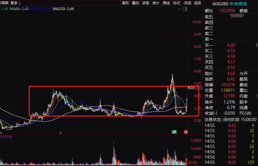 7月21日,南京中央商场(集团)股份有限公司(下称,中央商场)股价直接以涨停板开盘。截至当日收盘,其股价为4.6元,上涨10.05%,总市值51.9亿元。