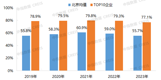 2022年以来,全国及北京房地产市场持续调整,客户置业信心低迷,加之客户收入预期偏弱,进一步削弱了消费者对购房和推荐的意愿。通过总体满意率、再购意向、推荐意向三要素,综合计算得出2023年北京居民忠诚度为55.7%,同比下降3.3%,居民忠诚度下滑至近5年最低位;标杆企业忠诚度为77.1%,同比下降2.2%。