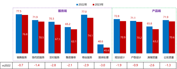 相较于去年,10个关键指标的满意度全面下滑,其中投诉处理、物业服务、交付服务等服务类指标, 房屋质量等产品类指标得分下降幅度较大,成为客户持续关注的焦点。总体而言,我们可以看到,服务类指标下降幅度相对较大,主要原因是市场下行,房企业绩承压,对销售阶段的服务、考核等格外关注,所以客户在销售期阶段体验较佳,但签约后,由于企业疏于监督和管理,售后服务中投诉处理、交付服务、整改维修及物业服务出现了明显回落。
