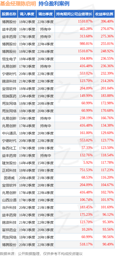 陈启明管理的华富价值增长混合基金在18年2季度买入博腾股份,在持有4年又1个季度后在22年3季度卖出。持有期间的估算收益率为396.4%,持有期间博腾股份在2018年到2022年的年报归属净利润增幅达1510.87%。