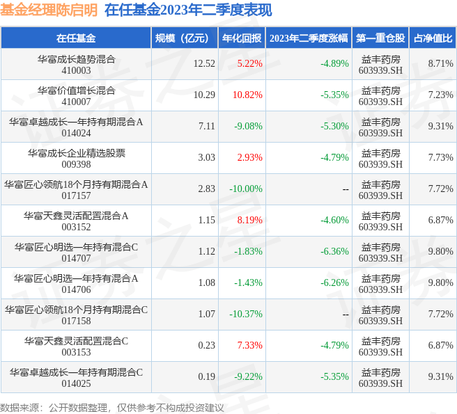 陈启明管理的华富竞争力优选混合A基金在16年2季度买入益丰药房,在持有3年又0个季度后在19年2季度卖出。持有期间的估算收益率为96.12%,持有期间益丰药房在2016年到2019年的年报营业总收入增幅达175.23%。