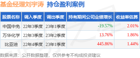 刘宇涛管理的鑫元鑫趋势灵活配置混合A基金在22年3季度买入万华化学,在持有3个季度后在23年2季度卖出。持有期间的估算收益率为1.86%,持有期间万华化学在2021年到2022年的年报营业总收入增幅达13.76%。