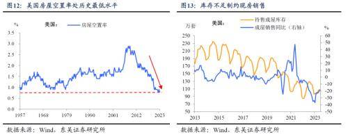 有房者“安于现状”导致现房供给“稀缺”。已经锁定了低抵押贷款利率(3-4%)的美国居民,在当前接近7%的更高利率水平下,除非迫不得已,不然不太可能出售现房转而购买新房。所以在当前环境下,现房业主并不乐于换房,致使房屋空置率处于历史最低水平。因此市场呈现出,待售二手房库存稀缺、销售低迷的情况(图12-13)。