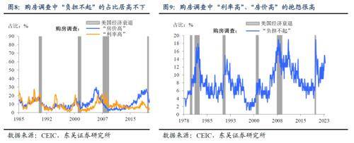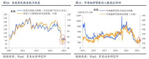 不过从需求端看,房价及利率的“双高”抑制美国居民购房需求。“史诗级”加息后,由图8-9可以看出,居民对“房价高”、“利率高”的抱怨是过去4次衰退前的最高水平。这反映出的结果是负担能力难以与之匹配,申请抵押贷款的人数接近10年以来的最低点(图10-11)。