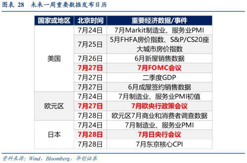 本周,美欧、美日国债利差均走阔。7月20日,10年期美欧、美日国债利差分别为132、339bp,较一周前分别上行13.1bp、9.5bp。