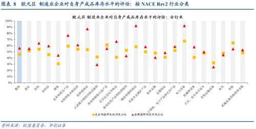 ①当前企业对库存水平评估结果明显高于历史均值的行业有:橡胶和塑料制品(当前值所处历史分位-历史均值对应的分位水平=33.9%)、纸和纸制品(33.1%)、化学品和化学制品(25.4%)、电力设备(24.5%)、机械和设备(16.8%)、皮革和相关产品(16.8%)、纺织品(13.7%)、服装(13.6%)。可以看到,劳密制造业与化学品行业中,认为当下库存偏高的企业明显偏多,可能指向这两个行业去库压力较大,对应着我国对欧盟劳密、化工品的出口可能较弱。