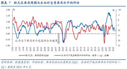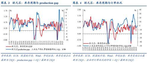 ②当下情况:本轮去库周期中,欧元区生产缺口于2022Q4见顶,读数为4.7%,随后连续两个季度下滑,截至23Q2,读数为2.2%,处于1996年有数据以来63%的历史分位水平,历史数据的均值(-0.03%)对应55%的历史分位,或意味着生产缺口后续仍有下行空间,带动去库。