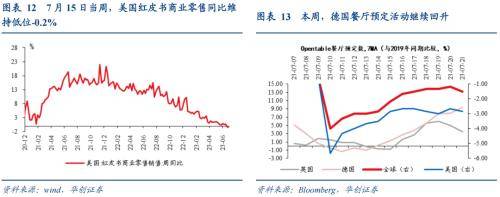 服务消费方面,本周,美、英餐厅预定活动先升后降,德国餐厅预定活动继续回升。根据 Opentable,截至7月21日,美、英餐厅预定活动相比于2019年同期的增速(7日移动平均)分别为-2.8%、3.5%,一周前分别为-3.5%、-0.7%。德国餐厅预定活动相比于2019年同期的增速(7日移动平均)则升至9.3%,一周前为0.2%。