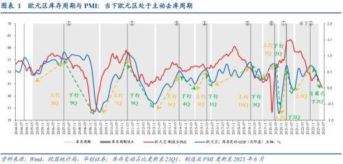 1、历史复盘视角。2004年以来的7轮库存周期中,去库期平均持续约4.3个季度。截至23Q1,欧元区去库期历经2个季度,按历史复盘经验来看,去库可能持续到三季度末。此外,截至6月欧元区制造业PMI仍在快速下滑,也指向当下去库周期或尚未见底。