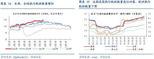 近期美国执行航班数量高位回落,本周欧洲主要国家执行航班数量有所下滑。美国方面,本周执行航班数量先升后降,到7月22日为止的一周内,美国执行航班数量累计为6.71万架 次,7月15日当周为6.6万架次。欧洲方面,7月22日当周,欧洲主要国家执行航班数量累计为8.98万架次,7月15日当周为9.04万架次。