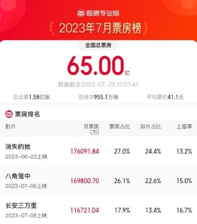 【2023年7月总票房破65亿】据猫眼专业版数据,7月23日17时,2023年7月总票房破65亿,《消失的她》《八角笼中》《长安三万里》分列7月票房榜前三位。(证券时报)