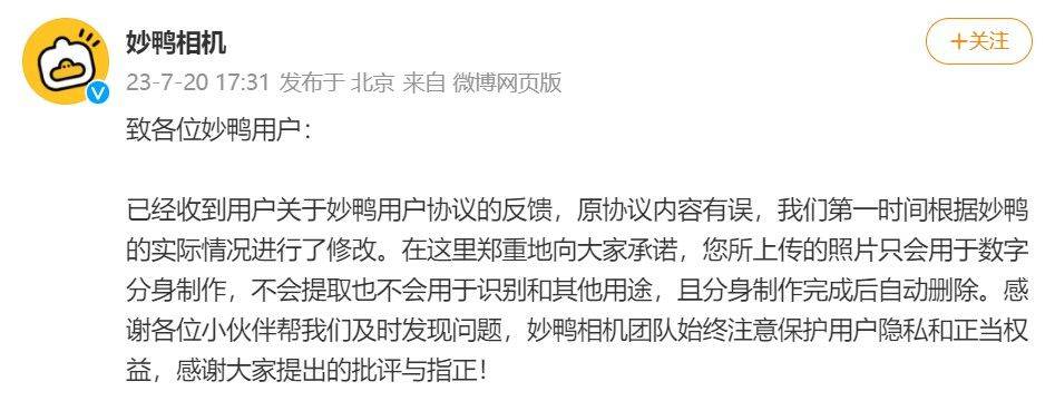 【新款AI相机引争议:妙鸭相机被质疑霸王条款】近日,一款名为“妙鸭相机”的AI相机的服务协议就被用户质疑过度索取隐私权限。对此,7月20日,妙鸭相机官方公众号回应称,已第一时间根据妙鸭的实际情况进行了修改,并表示用户所上传的照片只会用于数字分身制作,不会提取也不会用于识别和其他用途,且分身制作完成后自动删除。(南方都市报)