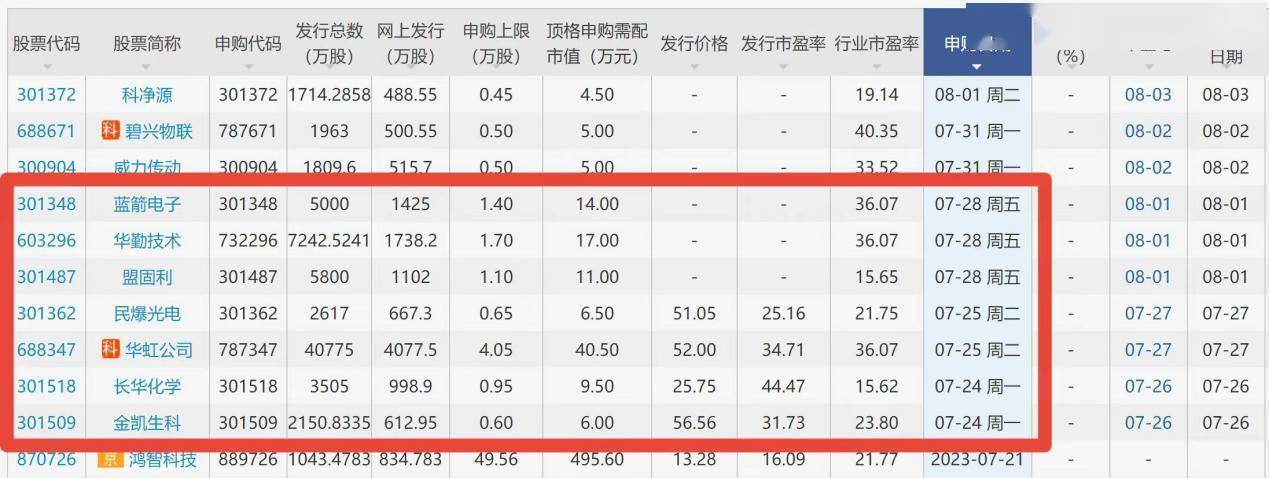 根据发行安排,金凯生科、长华化学将于周一申购,华虹公司、民爆光电将于周二申购,盟固利、华勤技术、蓝箭电子将于周五申购。