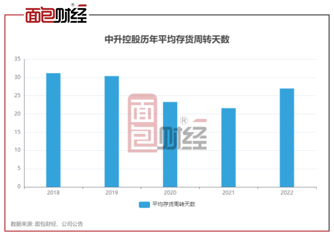 截至2022年末,中升控股存货金额为152.37亿元,相较2021年末的111.92亿元增长较为明显。同期,公司的平均存货周转天数从21.6天上升至27天。
