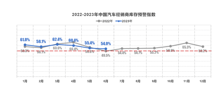 2023年以来,汽车经销商的库存没有明显好转,6月库存预警指数为54%,同比上升4.5个百分点,环比下降1.4个百分点。