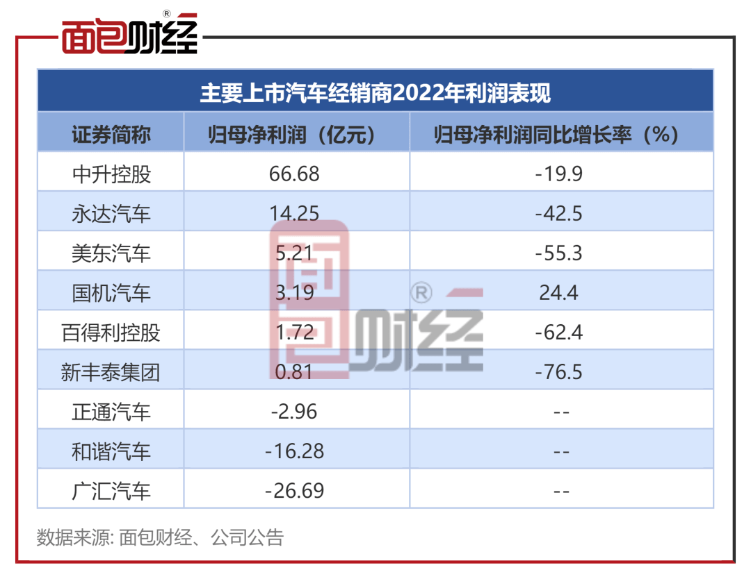 业绩承压不仅发生在中升控股,也体现在其他主要汽车经销商企业的财务数据上。数据显示,A股和港股上市的主要汽车经销商企业2022年归母净利润大多出现同比下滑或亏损。