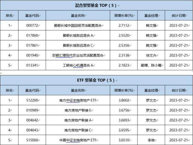 单基金方面,剔除掉创新封基类型基金的影响,上周业绩表现最好的基金为前海开源农业精选混合(LOF)A,周涨跌幅为4.1798%,为LOF型基金;分基金类型看,同样剔除掉分级杠杆及固定收益两类基金的影响,股票型基金冠军为工银国家战略股票,周涨跌幅为4.0720%;债券型基金冠军为工银3-5年国开债指数E,周涨跌幅为1.9298%; 混合型基金冠军为景顺长城中国回报灵活配置混合,周涨跌幅为2.7112%; 货币型基金冠军为格林日鑫月熠货币B,周涨跌幅为0.0645%;ETF型基金冠军为南方中证全指房地产ETF,周涨跌幅为3.8602%;LOF型基金冠军为前海开源农业精选混合(LOF)A,周涨跌幅为4.1798%;QDII基金冠军为华夏恒生香港上市生物科技ETF发起式联接(QDII)A,周涨跌幅为0.0339%;下面是不同类型基金周涨跌幅TOP5 (剔除掉分级基金的影响)