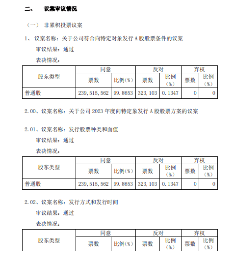 以《关于公司2023年度向特定对象发行A股股票方案的议案》为例,该议案的审议结果虽然是“通过”,但同意和反对票数分别为239,515,562和323,103,比例分别为99.8653%和0.1347%。