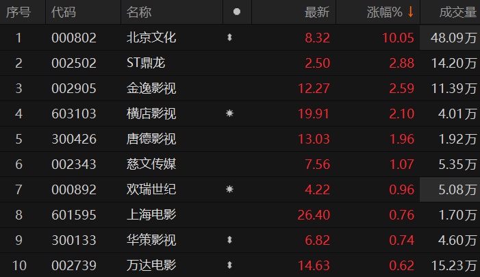 上证报中国证券网讯 7月24日,影视股反弹,截至9时44分,北京文化涨停,金逸影视、横店影视等跟涨。