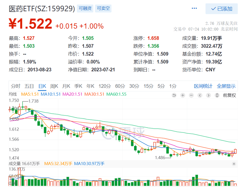 医药ETF(159929)跟踪中证医药卫生指数,指数成份股包含恒瑞医药、药明康德、迈瑞医疗、爱尔眼科等医药龙头,轻松实现医药板块整体行情一键布局。无证券账户可布局场外联接基金(A类:007076;C类:007077)。