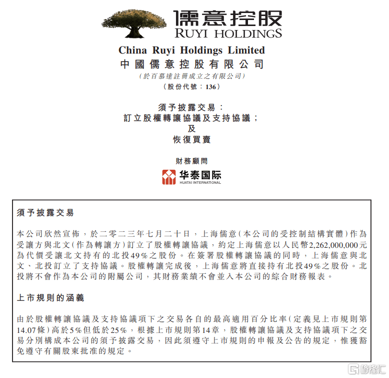 公告表示,股权转让完成后,上海儒意将直接持有北投49%之股份。上海儒意目前并无意向于北投委任董事,无意参与其日常运营和管理,北投将不会作为本公司的附属公司,其财务业绩不会并入本公司的综合财务报表。而北投将直接持有A股上市公司20%之股份等。
