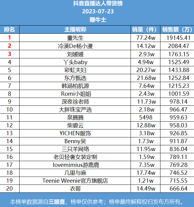 7月23日,抖音直播达人带货榜一董先生,销售额19145.41万;榜二冷漠De杨小漫,销售额2084.47万;榜三刘媛媛,销售额1763.15万。