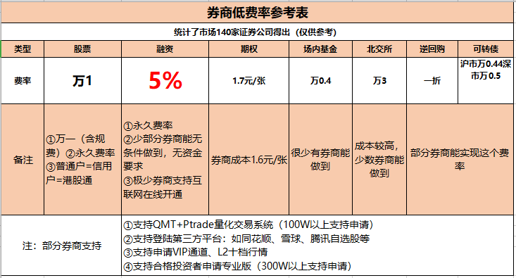 下表是我对比了市场上140家证券公司得出的低费率参考表: