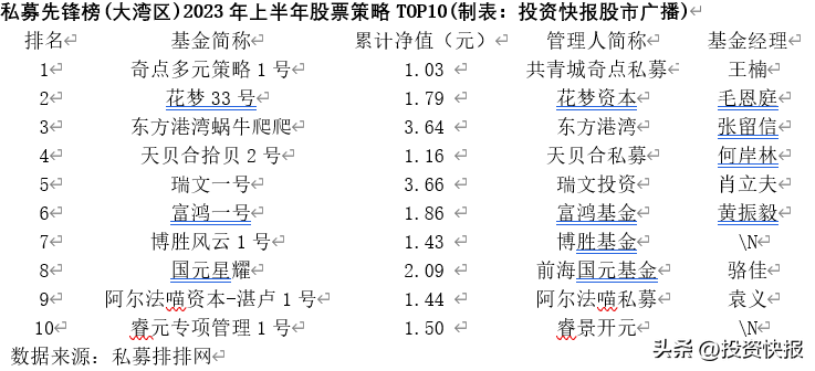 从投资快报股市广播主办的私募先锋榜(大湾区)股票策略前十排行榜单来看,不仅10只榜单基金今年上半年业绩全部超过40%,榜单前两名收益率超100%,更有东方港湾等百亿私募管理人的基金业绩上榜!