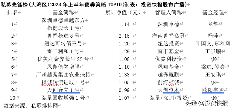 在私募先锋榜(大湾区)债券策略前十排行榜中,深圳卓德旗下的“深圳卓德卓越东方稳健成长1号”今年上半年业绩近15%。紧随其后,纽达投资、雷丰基金、优美利投资、凤翔基金、前海桢诚、弘量(深圳)投资收益率居前,成功入围榜单。