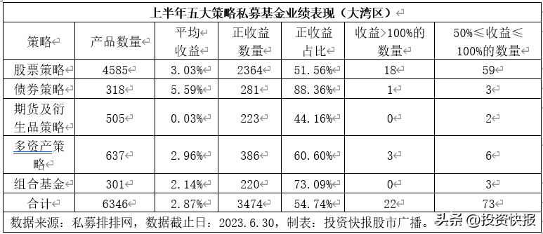私募排排网数据显示,截至今年上半年末,广东地区有业绩记录的6346只私募证券产品,上半年整体收益为2.87%,其中3474只产品实现正收益,占比为54.74%,实现正收益的产品中,22只上半年收益超100%,73只收益介于50-100%之间。