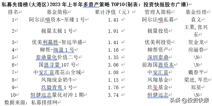 此外,极量投资、优美利投资、柳帮资产、深圳泰鼎、前海国恩资本、中安汇富、凤翔基金、恒健远志等私募管理人也有较好的表现,入围上半年多资产策略前十名。